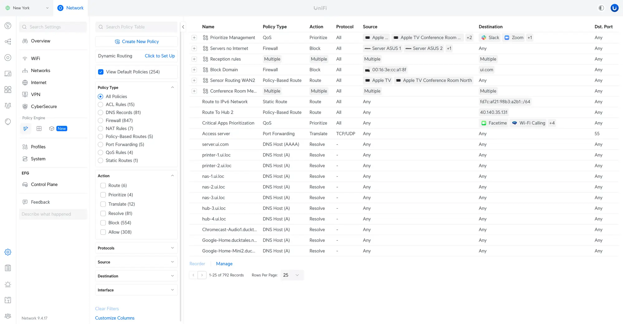 Continuing in that same idea as the Object Oriented Networking, the Master Policy Table in 9.4.19 also lets you set multiple rules from one single screen, including Firewall, ACL, DNS, NAT, QoS, Routing, and Port Forwarding.
