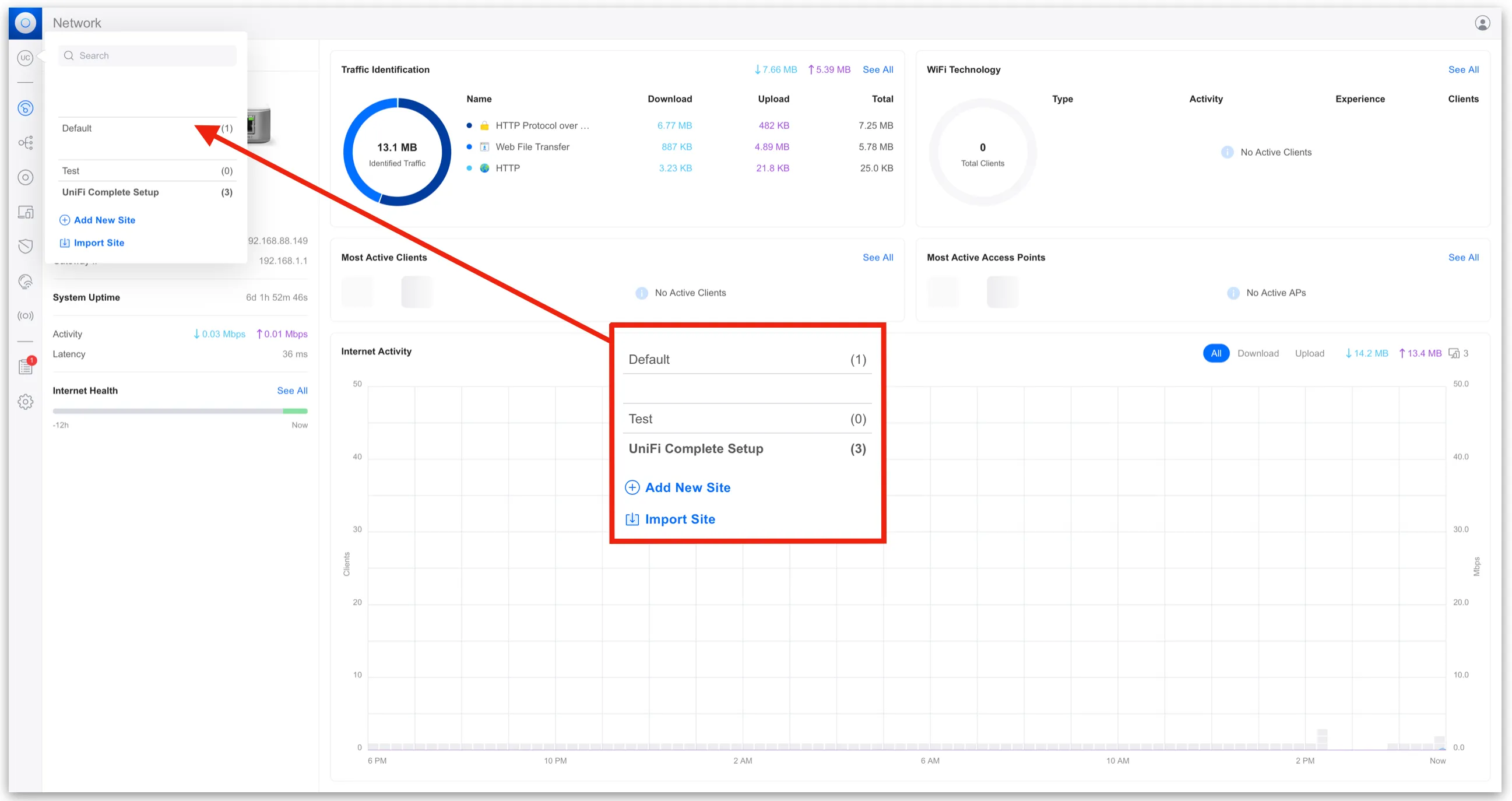 Click on the site switcher and choose the site where the UXG is. In our case, it is the Default site